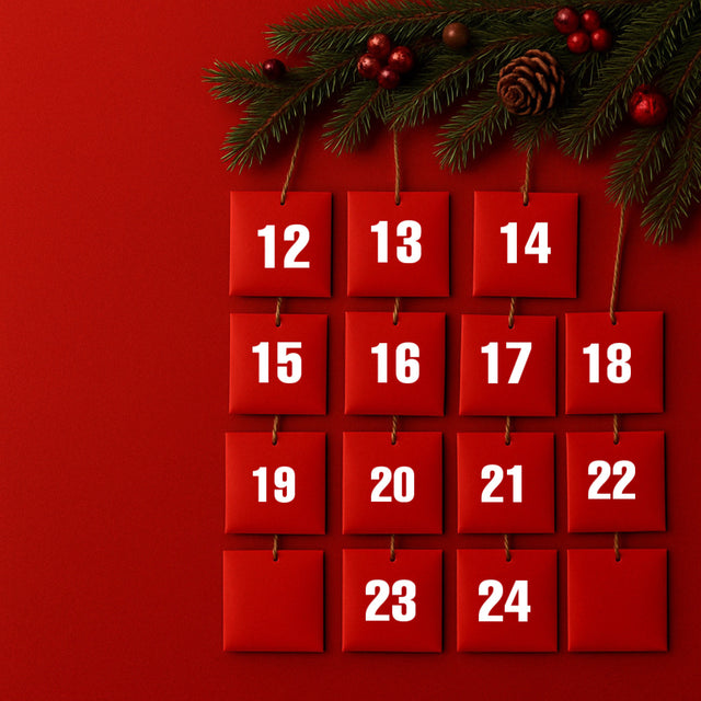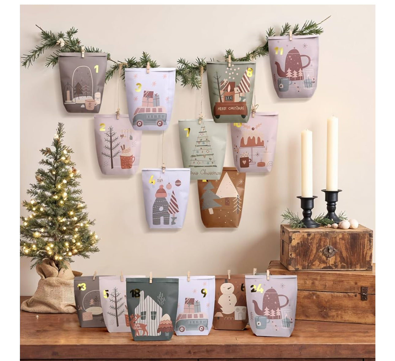 Il calendario dell’Avvento non è nella classica forma a scatola rigida con finestrelle, ma è composto da 12 bustine singole, numerate da 12 a 24, pensate per creare un’esperienza più intima, personalizzata e scenografica.💌